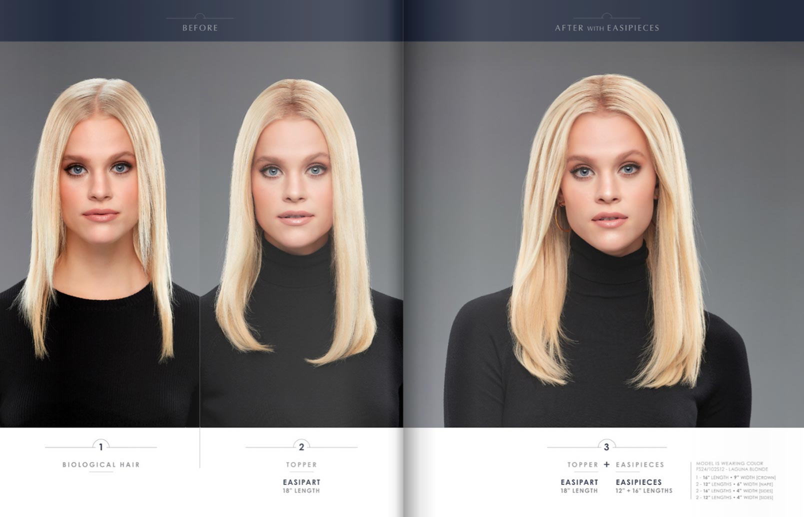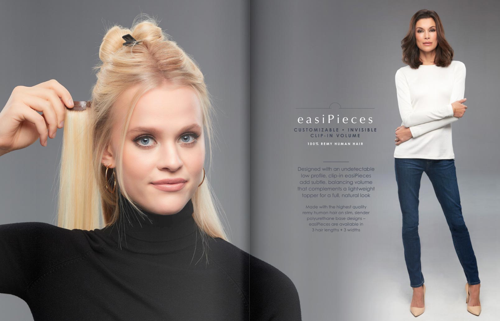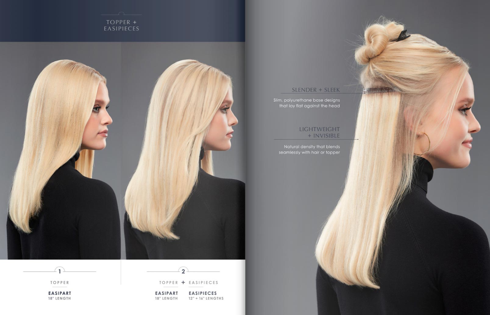 Customizable, invisible, clip-in volume. easiPieces add subtle, balancing volume that compliments a lightweight topper for a full, natural look.